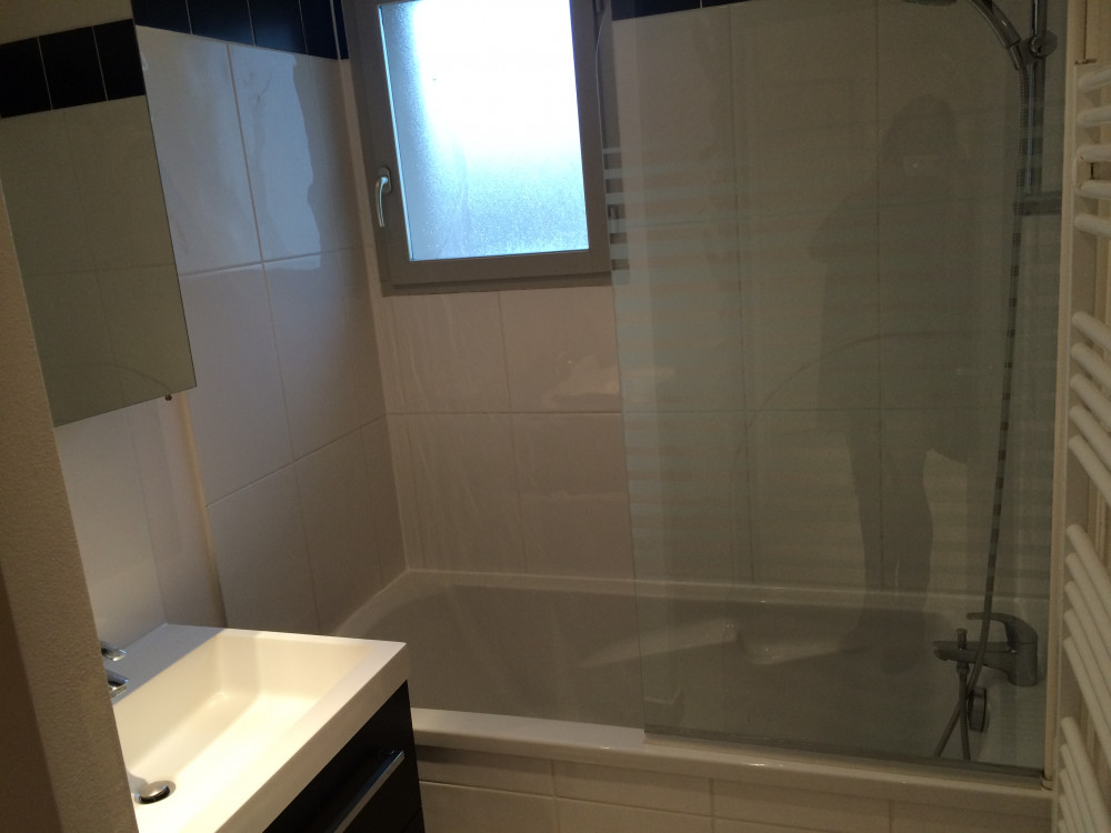 Salle de bains avec baignoire, meuble vasque, sèche serviettes, branchement lave-linge.