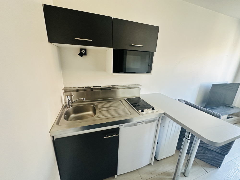 Cuisine ouverte avec mange debout et aménagée de meubles de rangement et d'électro-ménager (Plaques électriques, réfrigérateur, micro-ondes, lave-linge)